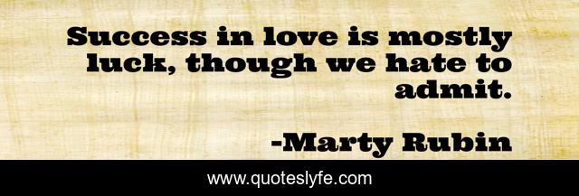This page presents the quote "Success in love is mostly luck, though we hate to admit.". Author of this quote is Marty Rubin. This quote is about love, success, affection, luck,.
