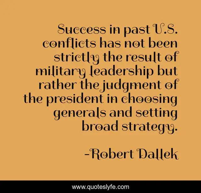 This page presents the quote "Success in past U.S. conflicts has not been strictly the result of military leadership but rather the judgment of the president in choosing generals and setting broad strategy.". Author of this quote is Robert Dallek. This quote is about past, military, success,.