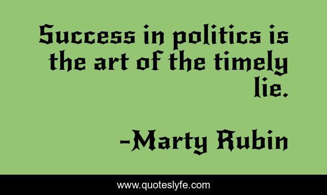 This page presents the quote "Success in politics is the art of the timely lie.". Author of this quote is Marty Rubin. This quote is about lies, success, politics,.