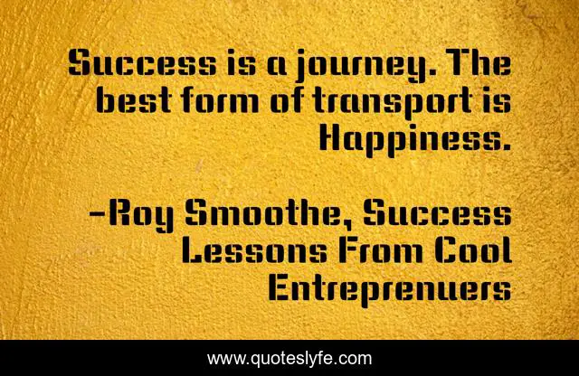 This page presents the quote "Success is a journey. The best form of transport is Happiness.". Author of this quote is Roy Smoothe, Success Lessons From Cool Entreprenuers. This quote is about personal-development-insights, entrepreneurship, business, self-help,.