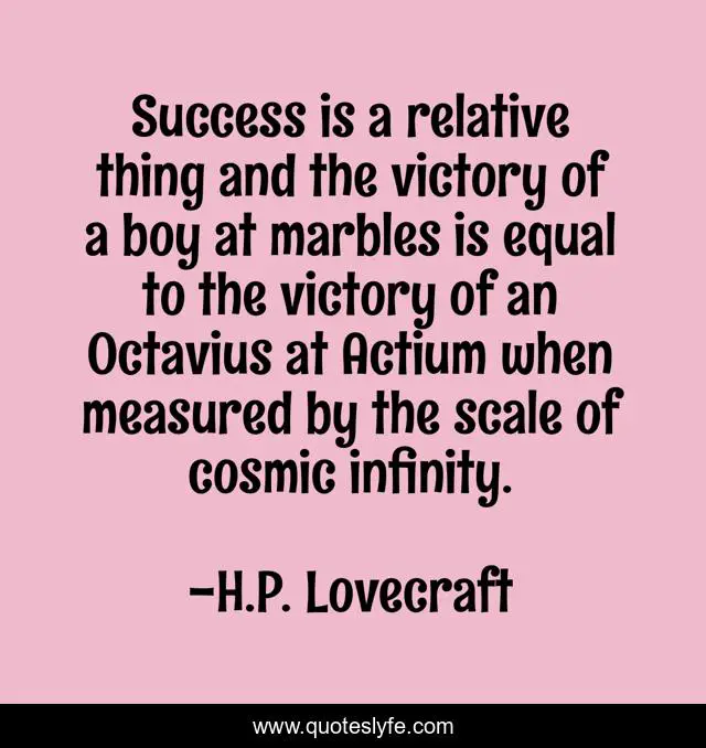 This page presents the quote "Success is a relative thing―and the victory of a boy at marbles is equal to the victory of an Octavius at Actium when measured by the scale of cosmic infinity.". Author of this quote is H.P. Lovecraft. This quote is about relativity, marbles, success, victory,.