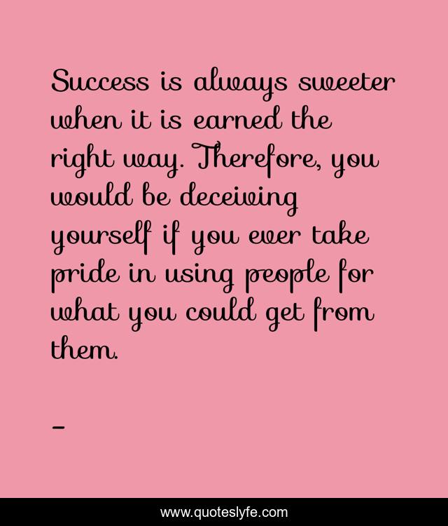 This page presents the quote "Success is always sweeter when it is earned the right way. Therefore, you would be deceiving yourself if you ever take pride in using people for what you could get from them.". Author of this quote is . This quote is about edmond-mbiaka, deceiving-yourself, taking-pride-in-negativity,.
