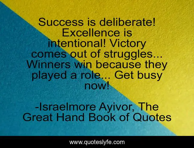 This page presents the quote "Success is deliberate! Excellence is intentional! Victory comes out of struggles... Winners win because they played a role... Get busy now!". Author of this quote is Israelmore Ayivor, The Great Hand Book of Quotes. This quote is about win, get-busy, victor, busy, deliberate, winner, excel, struggles, winning,.