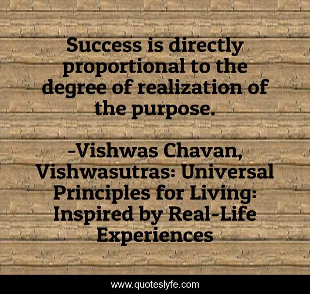 This page presents the quote "Success is directly proportional to the degree of realization of the purpose.". Author of this quote is Vishwas Chavan, Vishwasutras: Universal Principles for Living: Inspired by Real-Life Experiences. This quote is about success, vishwasutras, life-purpose, inspirational, life-philosophy, enthusiasm,.