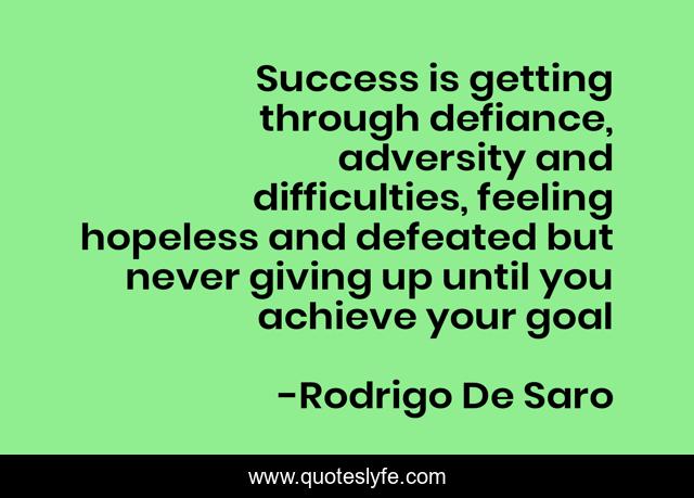 This page presents the quote "Success is getting through defiance, adversity and difficulties, feeling hopeless and defeated but never giving up until you achieve your goal". Author of this quote is Rodrigo De Saro. .