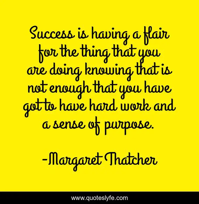 This page presents the quote "Success is having a flair for the thing that you are doing knowing that is not enough that you have got to have hard work and a sense of purpose.". Author of this quote is Margaret Thatcher. .
