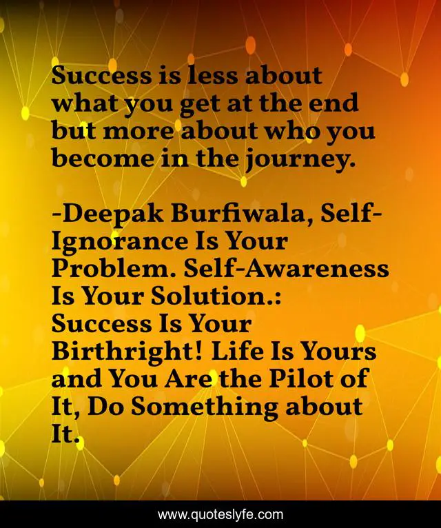 This page presents the quote "Success is less about what you get at the end but more about who you become in the journey.". Author of this quote is Deepak Burfiwala, Self-Ignorance Is Your Problem. Self-Awareness Is Your Solution.: Success Is Your Birthright! Life Is Yours and You Are the Pilot of It, Do Something about It.. This quote is about ispirational-life-true, leadership, success, entrepreneurship,.