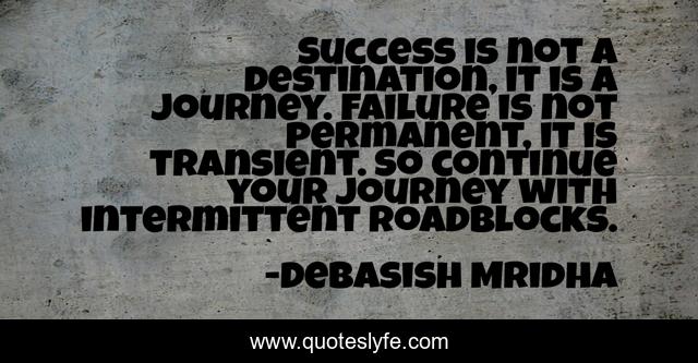 This page presents the quote "Success is not a destination, it is a journey. Failure is not permanent, it is transient. So continue your journey with intermittent roadblocks.". Author of this quote is Debasish Mridha. This quote is about life, love, knowledge, inspirational, intelligence, philosophy, wisdom, quotes, affection,.