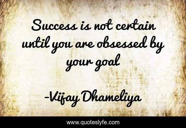 This page presents the quote "Success is not certain until you are obsessed by your goal". Author of this quote is Vijay Dhameliya. This quote is about confidence, management, success, positive, motivational, leadership, goals, inspirational, enthusiasm,.
