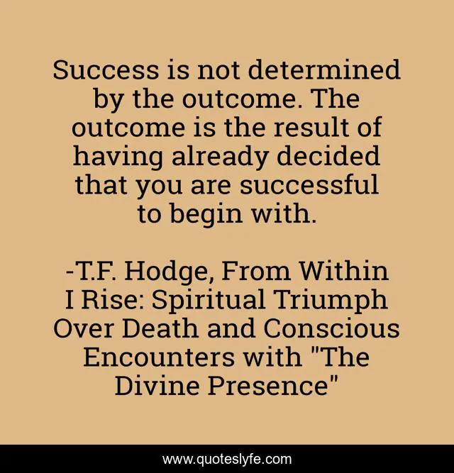 "T.F. Hodge, From Within I Rise: Spiritual Triumph Over Death and Conscious Encounters with "The Divine Presence" Quotes." Quoteslyfe.com, 2025. Sat. 06 Dec. 2025. <https://www.quoteslyfe.com/quote/Success-is-not-determined-by-the-outcome-22109>.