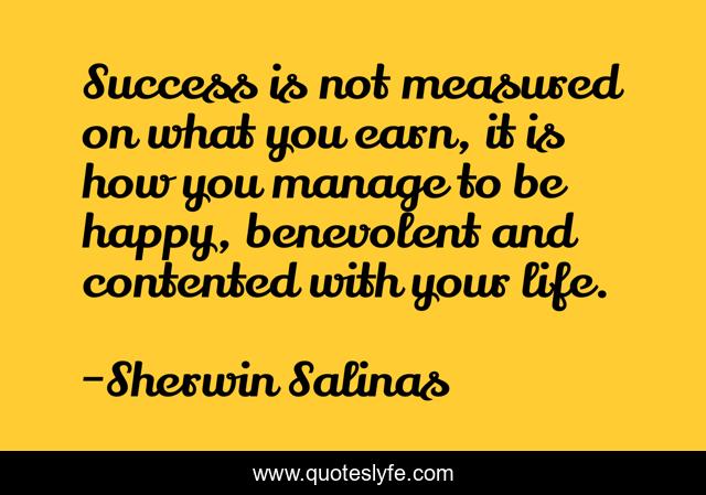 This page presents the quote "Success is not measured on what you earn, it is how you manage to be happy, benevolent and contented with your life.". Author of this quote is Sherwin Salinas. This quote is about life, love, success, affection, happy,.