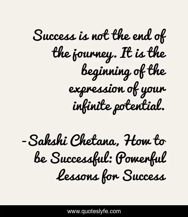 This page presents the quote "Success is not the end of the journey. It is the beginning of the expression of your infinite potential.". Author of this quote is Sakshi Chetana, How to be Successful: Powerful Lessons for Success. This quote is about self-help, self-improvement, success, self-help-book,.