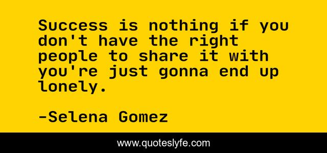 This page presents the quote "Success is nothing if you don't have the right people to share it with you're just gonna end up lonely.". Author of this quote is Selena Gomez. This quote is about lonely, end, people,.