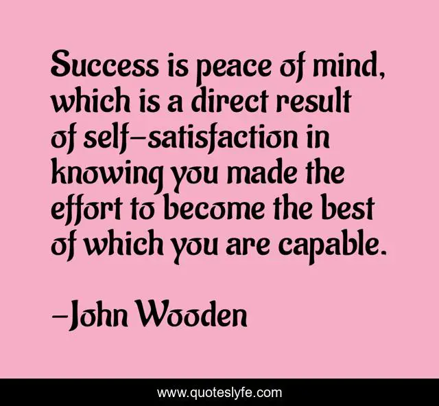 This page presents the quote "Success is peace of mind, which is a direct result of self-satisfaction in knowing you made the effort to become the best of which you are capable.". Author of this quote is John Wooden. This quote is about peace, mind, success,.