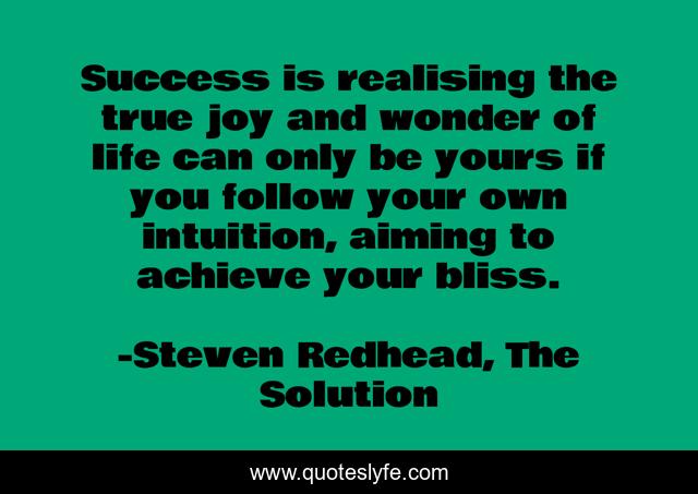 This page presents the quote "Success is realising the true joy and wonder of life can only be yours if you follow your own intuition, aiming to achieve your bliss.". Author of this quote is Steven Redhead, The Solution. This quote is about intuition, realising, success, joy, life, bliss, achieve, wonder,.