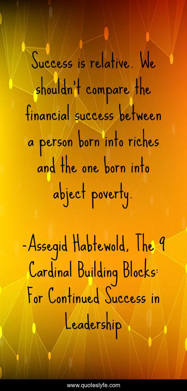 This page presents the quote "Success is relative. We shouldn't compare the financial success between a person born into riches and the one born into abject poverty.". Author of this quote is Assegid Habtewold, The 9 Cardinal Building Blocks: For Continued Success in Leadership. This quote is about relative, poverty, riches, finance, success,.