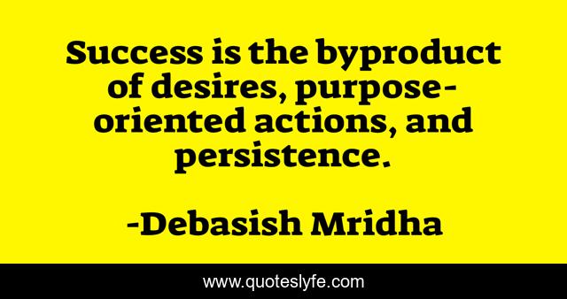 This page presents the quote "Success is the byproduct of desires, purpose-oriented actions, and persistence.". Author of this quote is Debasish Mridha. This quote is about life, love, knowledge, inspirational, intelligence, philosophy, wisdom, quotes, affection,.