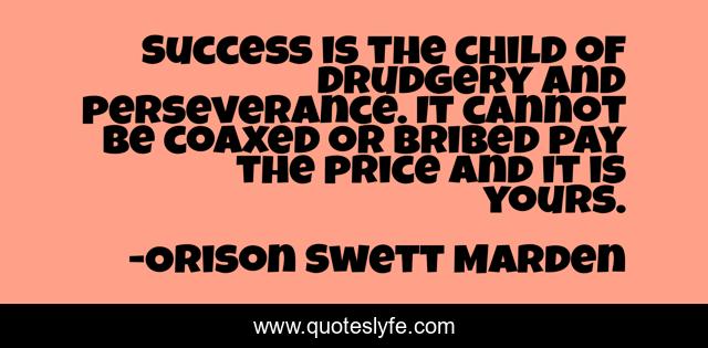 This page presents the quote "Success is the child of drudgery and perseverance. It cannot be coaxed or bribed pay the price and it is yours.". Author of this quote is Orison Swett Marden. This quote is about perseverance, price, child,.