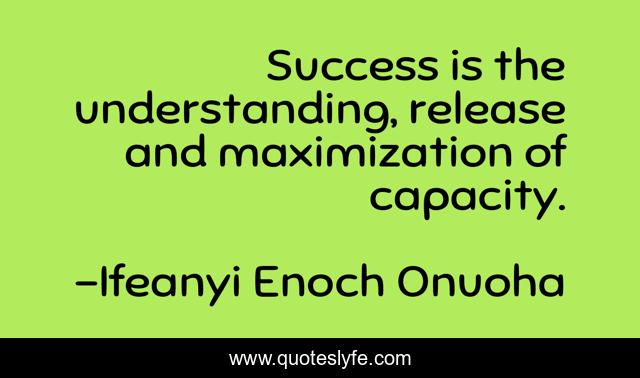 This page presents the quote "Success is the understanding, release and maximization of capacity.". Author of this quote is Ifeanyi Enoch Onuoha. This quote is about ifeanyi-enoch-onuoha, greatness, life, success, inspiration,.