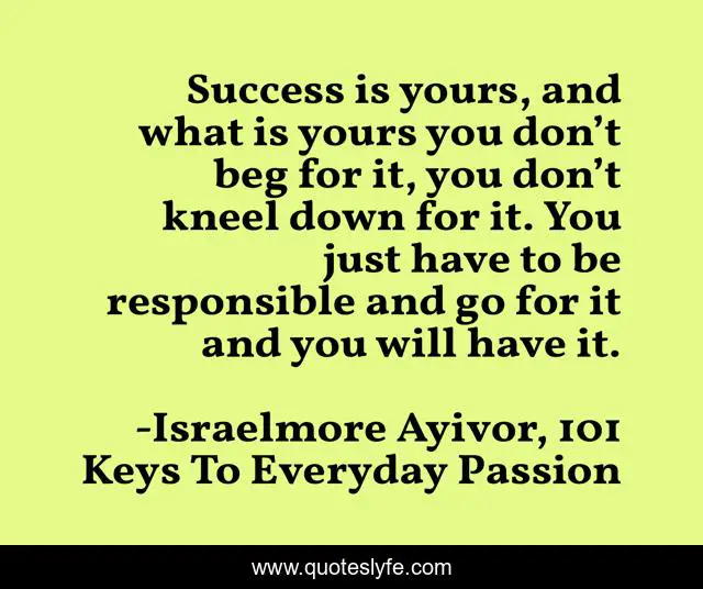 This page presents the quote "Success is yours, and what is yours you don’t beg for it, you don’t kneel down for it. You just have to be responsible and go for it and you will have it.". Author of this quote is Israelmore Ayivor, 101 Keys To Everyday Passion. This quote is about motivations, food-for-thought, inspirations, success, beggar, responsible, beg, quotes, personal-development,.