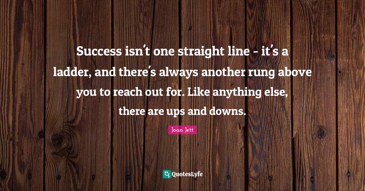 This page presents the quote "Success isn't one straight line - it's a ladder, and there's always another rung above you to reach out for. Like anything else, there are ups and downs.". Author of this quote is Joan Jett. This quote is about lines, ladders, reach out, success,.