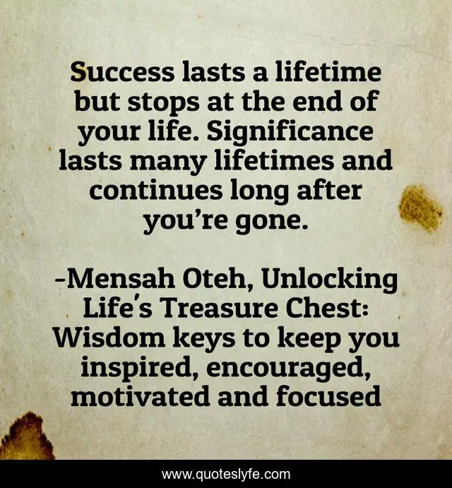 "Mensah Oteh, Unlocking Life's Treasure Chest: Wisdom keys to keep you inspired, encouraged, motivated and focused Quotes." Quoteslyfe.com, 2025. Fri. 05 Dec. 2025. <https://www.quoteslyfe.com/quote/Success-lasts-a-lifetime-but-stops-at-15749>.