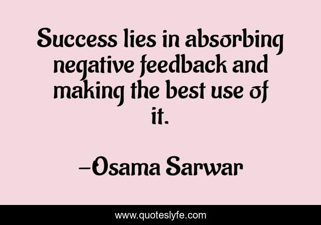 This page presents the quote "Success lies in absorbing negative feedback and making the best use of it.". Author of this quote is Osama Sarwar. This quote is about criticism, feedback, success, personality,.