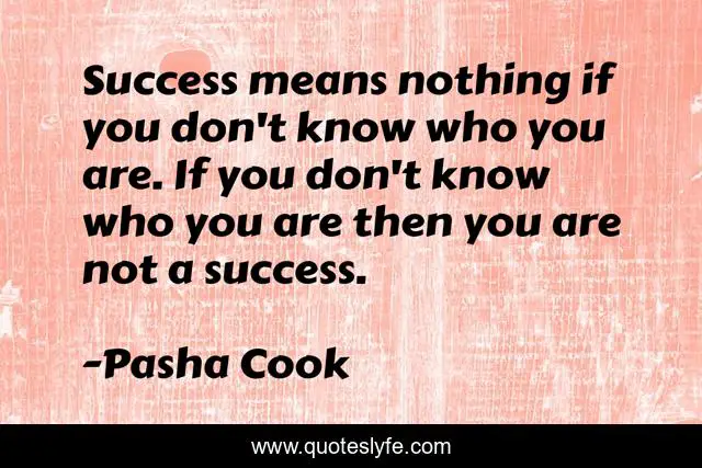 This page presents the quote "Success means nothing if you don't know who you are. If you don't know who you are then you are not a success.". Author of this quote is Pasha Cook. This quote is about educational, success-coaching, positive, motivational, life, knowledge-of-self, optimistic, inspirational, enthusiasm,.