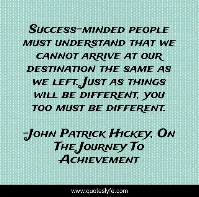 This page presents the quote "Success-minded people must understand that we cannot arrive at our destination the same as we left. Just as things will be different, you too must be different.". Author of this quote is John Patrick Hickey, On The Journey To Achievement. This quote is about personal-development, achievement, goal-setting, success, goals,.