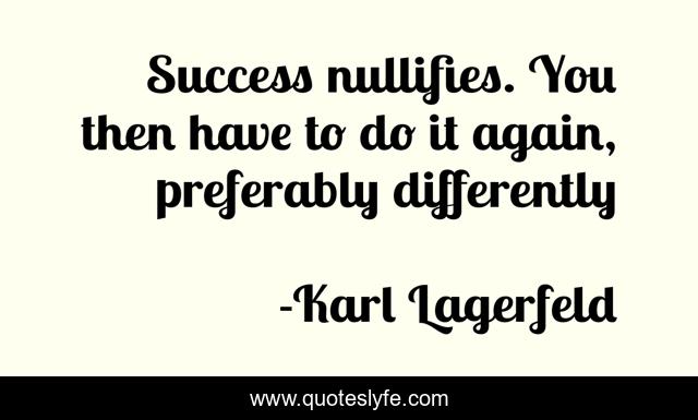 This page presents the quote "Success nullifies. You then have to do it again, preferably differently". Author of this quote is Karl Lagerfeld. This quote is about designer, success, fashion, inspirational, enthusiasm, chanel,.