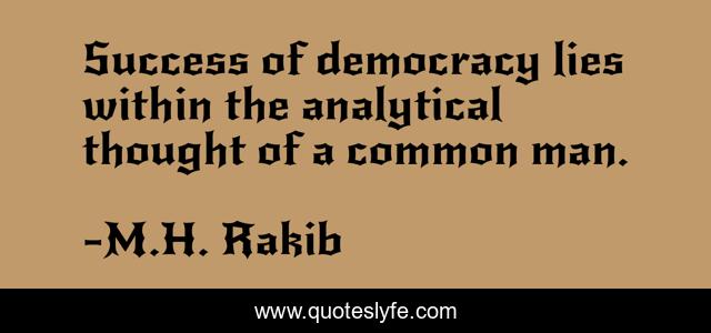 This page presents the quote "Success of democracy lies within the analytical thought of a common man.". Author of this quote is M.H. Rakib. This quote is about common-man, political-philosophy, democracy, success,.