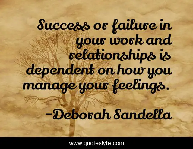 This page presents the quote "Success or failure in your work and relationships is dependent on how you manage your feelings.". Author of this quote is Deborah Sandella. This quote is about success, women-authors, feelings, self-improvement, inspirational, enthusiasm,.