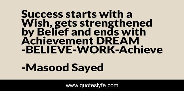This page presents the quote "Success starts with a Wish, gets strengthened by Belief and ends with Achievement DREAM -BELIEVE-WORK-Achieve". Author of this quote is Masood Sayed. This quote is about positive, confidence, motivational, optimistic,.