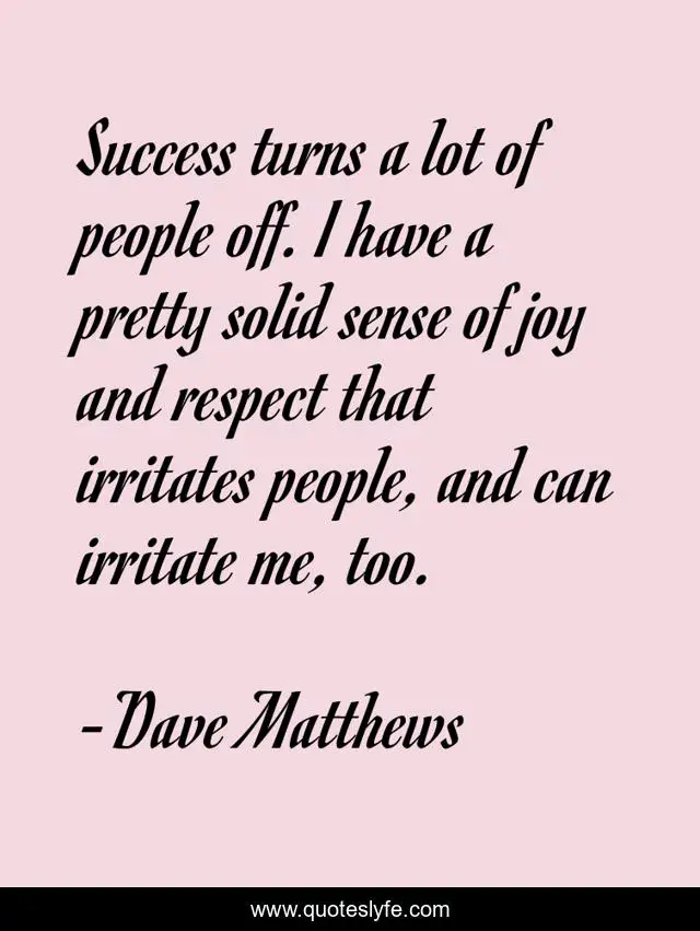 This page presents the quote "Success turns a lot of people off. I have a pretty solid sense of joy and respect that irritates people, and can irritate me, too.". Author of this quote is Dave Matthews. This quote is about me, joy, success,.