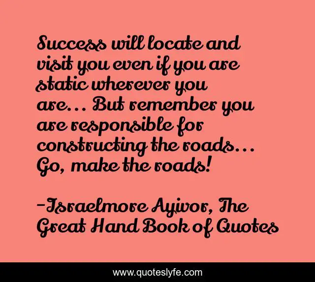 This page presents the quote "Success will locate and visit you even if you are static wherever you are... But remember you are responsible for constructing the roads... Go, make the roads!". Author of this quote is Israelmore Ayivor, The Great Hand Book of Quotes. This quote is about locate, food-for-thought, resposibility, remember, constructing, success, take-actions, responsible, make-the-roads,.