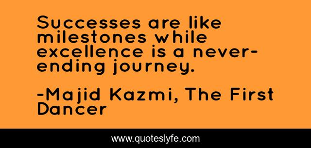 This page presents the quote "Successes are like milestones while excellence is a never-ending journey.". Author of this quote is Majid Kazmi, The First Dancer. This quote is about life, success, successful, self-help, journey, excellence, self-improvement, greatness,.