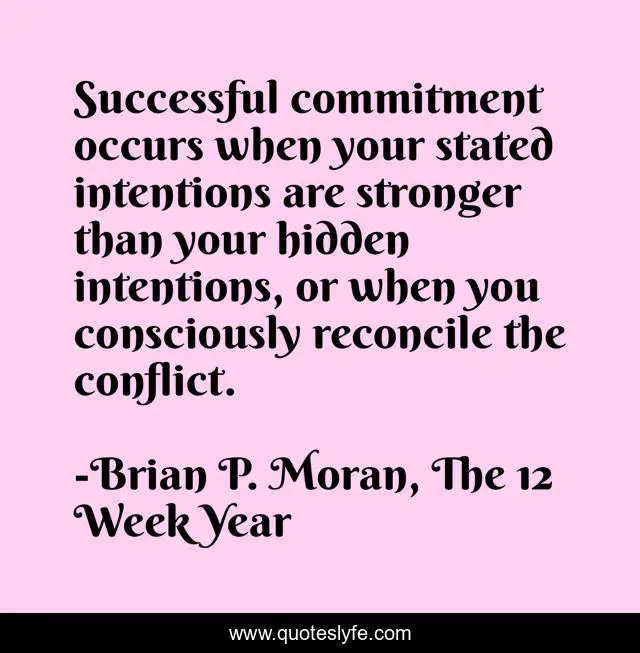 This page presents the quote "Successful commitment occurs when your stated intentions are stronger than your hidden intentions, or when you consciously reconcile the conflict.". Author of this quote is Brian P. Moran, The 12 Week Year. This quote is about intention, commitment,.