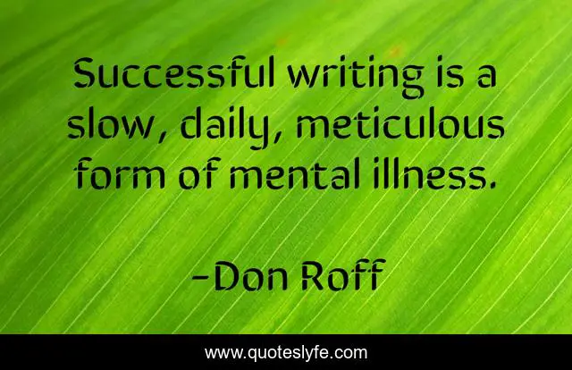 This page presents the quote "Successful writing is a slow, daily, meticulous form of mental illness.". Author of this quote is Don Roff. This quote is about slow, success, meticulous, daily, writing, insanity, mental-illness,.
