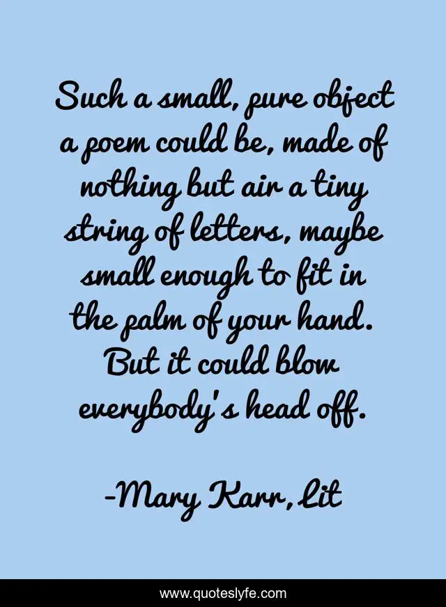 This page presents the quote "Such a small, pure object a poem could be, made of nothing but air a tiny string of letters, maybe small enough to fit in the palm of your hand. But it could blow everybody's head off.". Author of this quote is Mary Karr, Lit. This quote is about poem, poetry,.