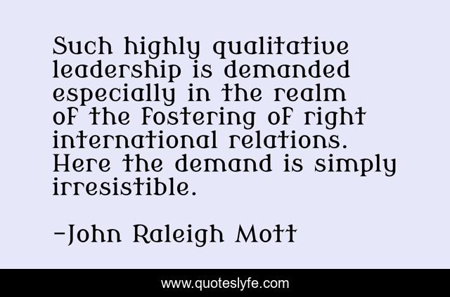 This page presents the quote "Such highly qualitative leadership is demanded especially in the realm of the fostering of right international relations. Here the demand is simply irresistible.". Author of this quote is John Raleigh Mott. This quote is about right, here, demand,.