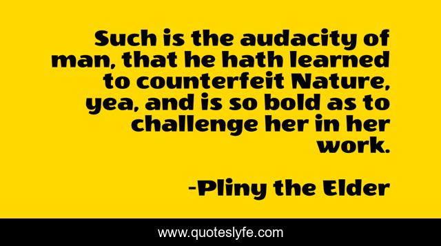 This page presents the quote "Such is the audacity of man, that he hath learned to counterfeit Nature, yea, and is so bold as to challenge her in her work.". Author of this quote is Pliny the Elder. This quote is about challenge, nature, man,.