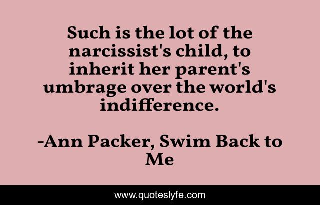 This page presents the quote "Such is the lot of the narcissist's child, to inherit her parent's umbrage over the world's indifference.". Author of this quote is Ann Packer, Swim Back to Me. .