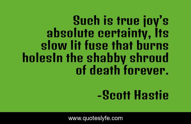 This page presents the quote "Such is true joy’s absolute certainty, Its slow lit fuse that burns holesIn the shabby shroud of death forever.". Author of this quote is Scott Hastie. This quote is about forever, death, burns, shabby, shroud, joy, certainty, burn, holes,.