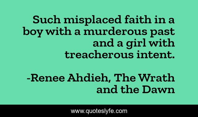 This page presents the quote "Such misplaced faith in a boy with a murderous past and a girl with treacherous intent.". Author of this quote is Renee Ahdieh, The Wrath and the Dawn. This quote is about dark, the-wrath-and-the-dawn, arabian-nights,.