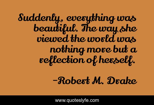 This page presents the quote "Suddenly, everything was beautiful. The way she viewed the world was nothing more but a reflection of herself.". Author of this quote is Robert M. Drake. This quote is about lovequotes, sadquotes, poetry, quotes, instadaily, happyquotes, relationships, sayings, writer,.