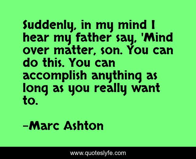 This page presents the quote "Suddenly, in my mind I hear my father say, 'Mind over matter, son. You can do this. You can accomplish anything as long as you really want to.". Author of this quote is Marc Ashton. This quote is about family, family-history, life-lessons,.