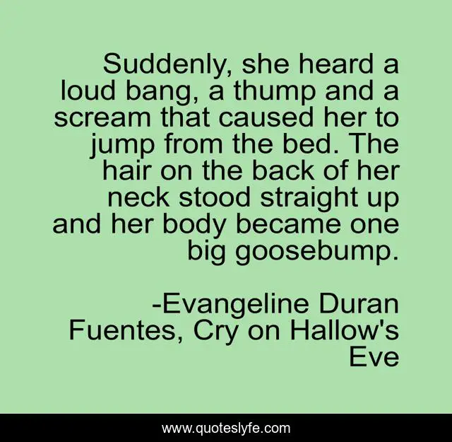 This page presents the quote "Suddenly, she heard a loud bang, a thump and a scream that caused her to jump from the bed. The hair on the back of her neck stood straight up and her body became one big goosebump.". Author of this quote is Evangeline Duran Fuentes, Cry on Hallow's Eve. This quote is about children-s-books, middle-grade, horror, goose-bumps, terror, fear,.