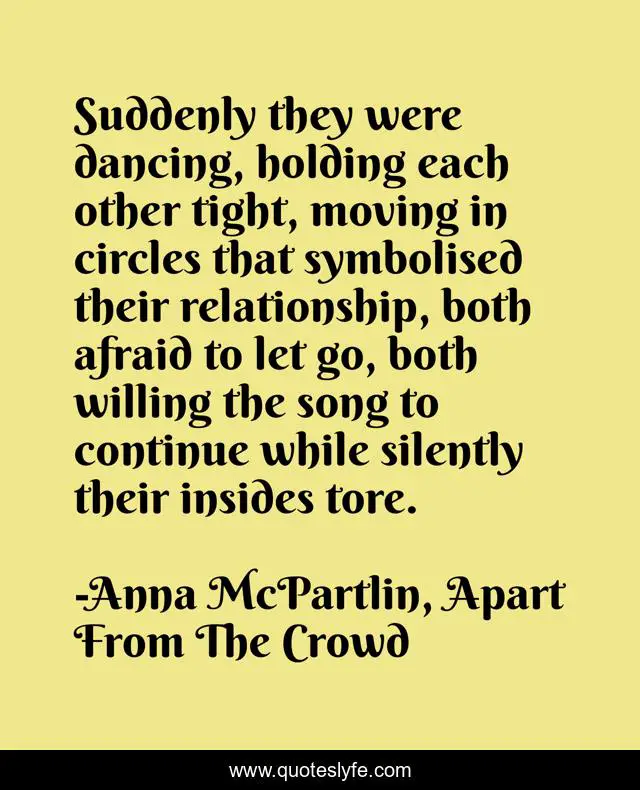 This page presents the quote "Suddenly they were dancing, holding each other tight, moving in circles that symbolised their relationship, both afraid to let go, both willing the song to continue while silently their insides tore.". Author of this quote is Anna McPartlin, Apart From The Crowd. This quote is about heartbreak, co, first-love, lost-love,.