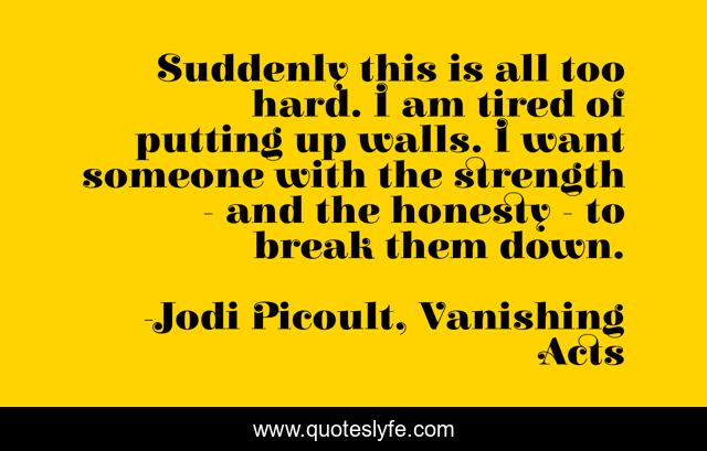 This page presents the quote "Suddenly this is all too hard. I am tired of putting up walls. I want someone with the strength - and the honesty - to break them down.". Author of this quote is Jodi Picoult, Vanishing Acts. This quote is about break, wall, strength, honesty,.