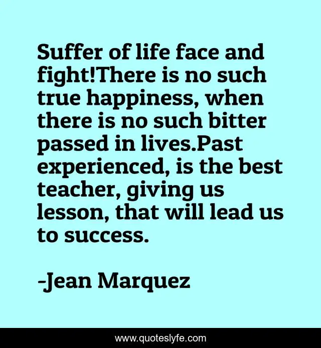This page presents the quote "Suffer of life face and fight!There is no such true happiness, when there is no such bitter passed in lives.Past experienced, is the best teacher, giving us lesson, that will lead us to success.". Author of this quote is Jean Marquez. .